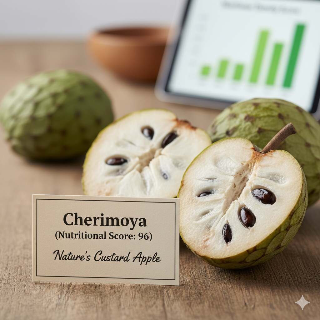 It is rare to find a fruit ranking this high, but the Cherimoya (often called the Custard Apple) is a nutritional anomaly. It is dense, fleshy, and remarkably sweet, yet it manages to pack a massive punch of Potassium, Magnesium, and Vitamin C.