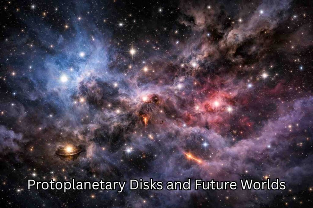 Some of these young stars have protoplanetary disks around them. These disks are flat and composed of gas, ice, and dust. These materials take millions of years to come together and form planets, moons, and asteroids.